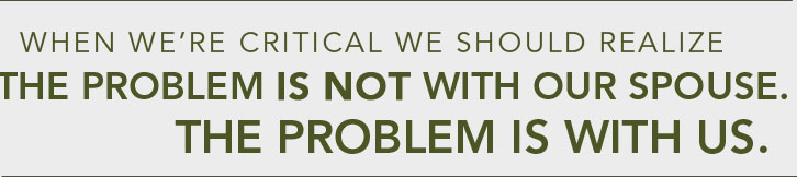 We notice, study, analyze, and organize our lists of our partner’s faults. Then we undertake a deliberate spousal improvement project or–in weak moments—we explode with complaint. Anyone who has objectively observed human nature knows the effect of either cool or hot criticism: it creates discouragement and defensiveness. . . . Criticism does not lead to repentance and growth; it leads to anger, defensiveness and distance” (p. 125).